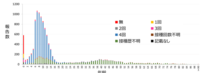 (注意)三種混合ワクチンの追加接種について百日咳の患者さんの年齢分布がありからになり、小学校中学校に患者報告数のピークがあります。
